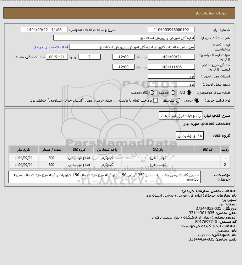 شرح کلی نیاز: ران و فیله مرغ تازه شمال