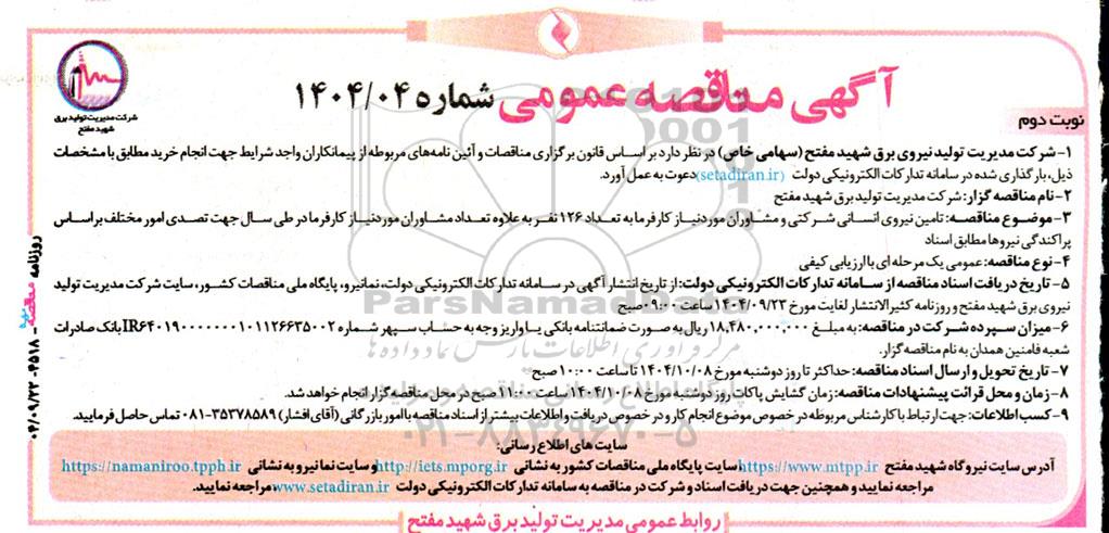 3- موضوع مناقصه: تامین نیروی انسانی شرکتی و مشاوران موردنیاز کارفرما به تعداد 126 نفر به علاوه تعداد مشاوران مورد نیاز کارفرما در طی سال جهت تصدی امور مختلف بر اساس پراکندگی نیروها مطابق اسناد
