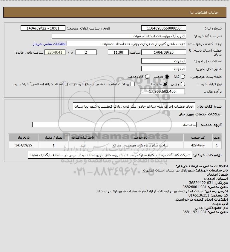 شرح کلی نیاز: انجام عملیات اجرای بدنه سازی جاده رینگ غربی پارک کوهستان شهر بهارستان