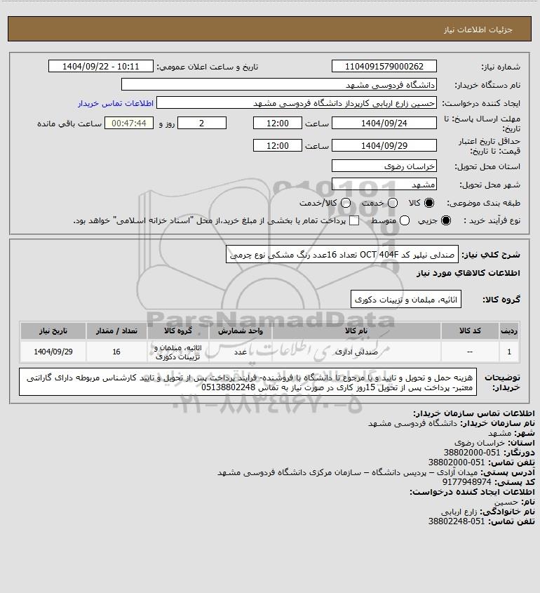 شرح کلی نیاز: صندلی نیلپر کد OCT 404F تعداد 16عدد رنگ مشکی نوع چرمی