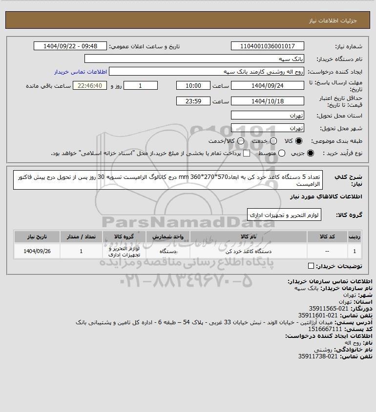 | 1 | -- | دستگاه کاغذ خرد کن | دستگاه | لوازم التحریر و تجهیزات اداری | 1 | 1404/09/26 |