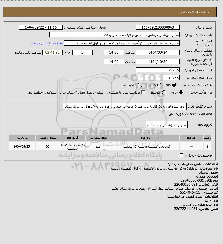 شرح کلی نیاز: پودر سودالایم//60 گالن//پرداخت 6 ماهه در صورت وجود بودجه//تحویل در بیمارستان