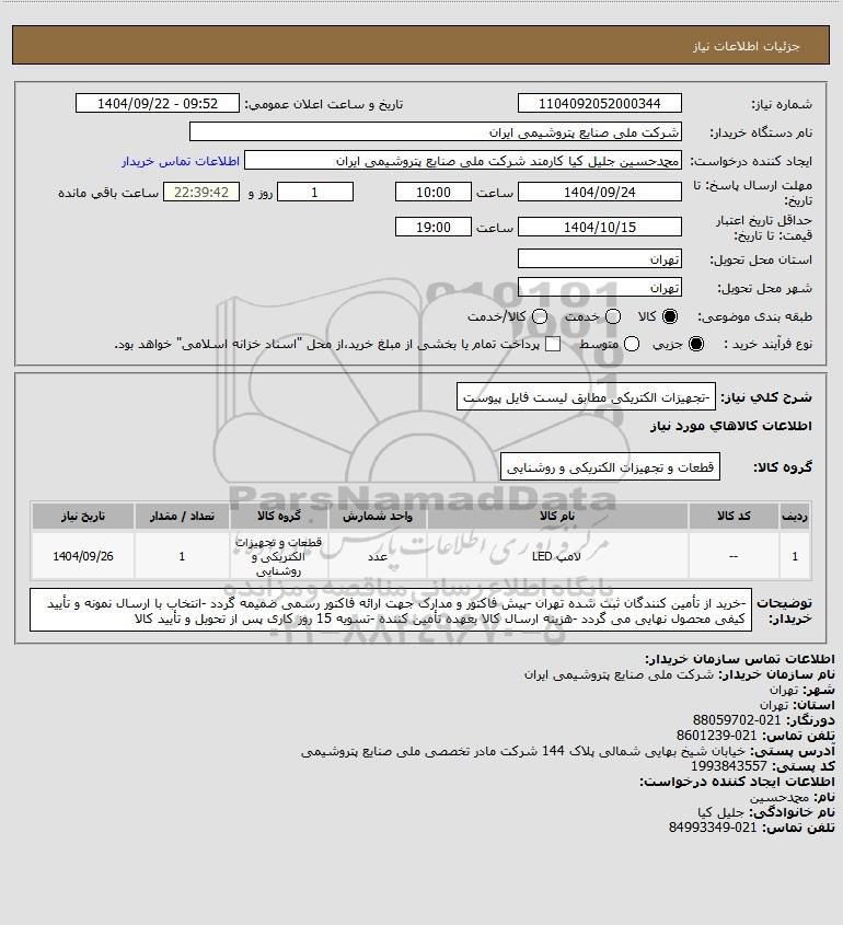 شرح کلی نیاز: -تجهیزات الکتریکی مطابق لیست فایل پیوست