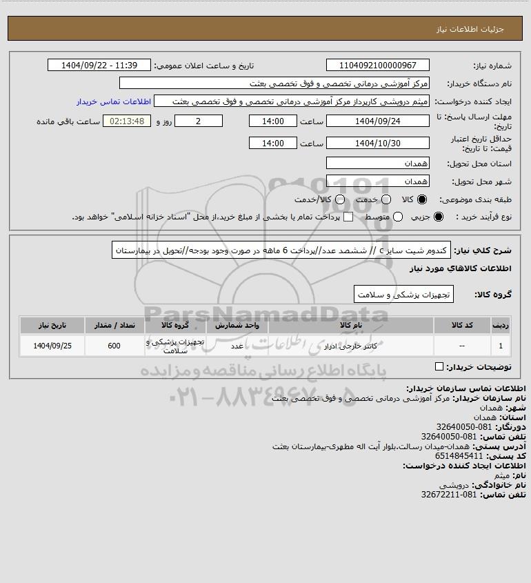 | 1 | -- | کاتتر خارجی ادرار | عدد | تجهیزات پزشکی و سلامت | 600 | 1404/09/25 |