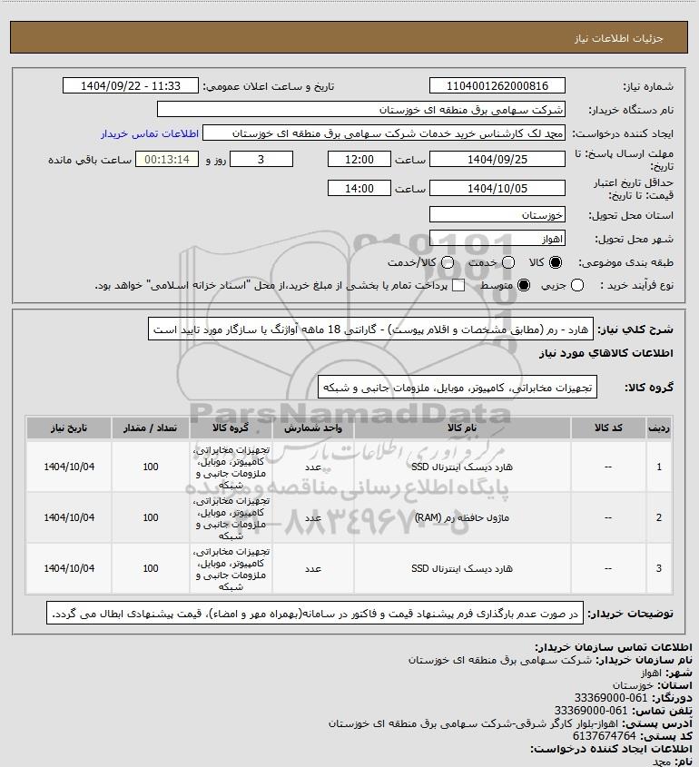 | 3 | -- | هارد دیسک اینترنال SSD | عدد | تجهیزات مخابراتی، کامپیوتر، موبایل، ملزومات جانبی و شبکه | 100 | 1404/10/04 |