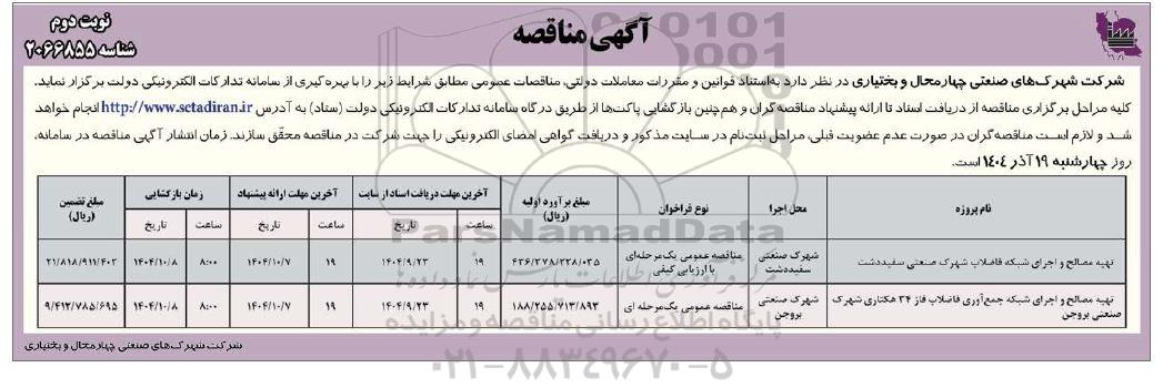 شرکت شهرک های صنعتی چهار محال و بختیاری در نظر دارد به استناد قوانین و مقررات معاملات دولتی مناقصات عمومی مطابق شرایط زیر را با بهره گیری از سامانه تدارکات الکترونیکی دولت برگزار نماید. کلیه مراحل برگزاری مناقصه از دریافت اسناد تا ارائه پیشنهاد مناقصه گران و بازگشایی پاکتها از طریق درگاه سامانه تدارکات الکترونیکی دولت (ستاد) به آدرس سایت ستاد انجام خواهد شد و لازم است مناقصه گران در صورت عدم عضویت قبلی مراحل ثبت نام در سایت مذکور و دریافت گواهی امضای الکترونیکی را جهت شرکت در مناقصه محقق سازند. تاریخ انتشار مناقصات در سامانه روز چهارشنبه 19 آذر 1404 است.