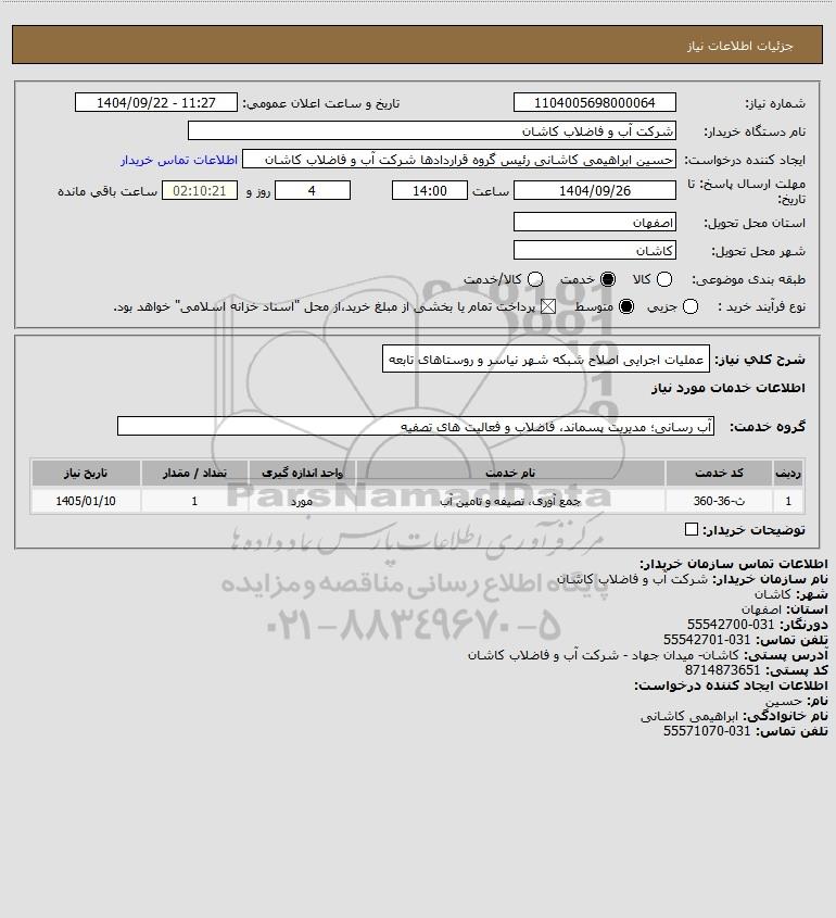 نام دستگاه خریدار:شرکت آب و فاضلاب کاشان