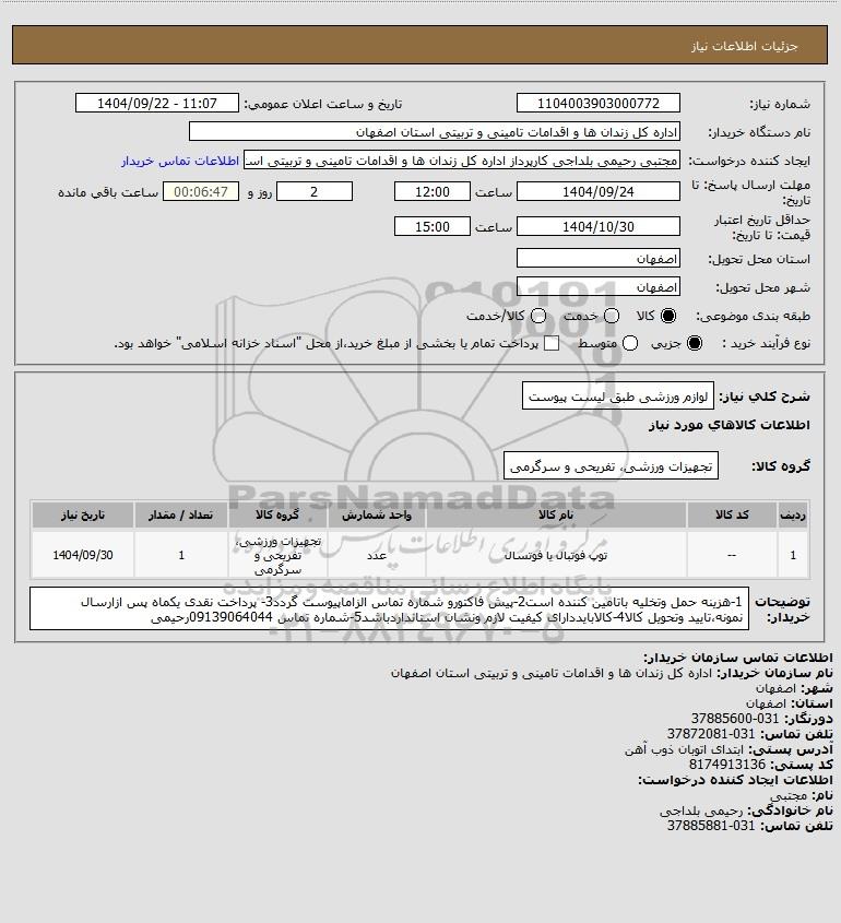 | 1 | -- | توپ فوتبال یا فوتسال | عدد | تجهیزات ورزشی، تفریحی و سرگرمی | 1 | 1404/09/30 |