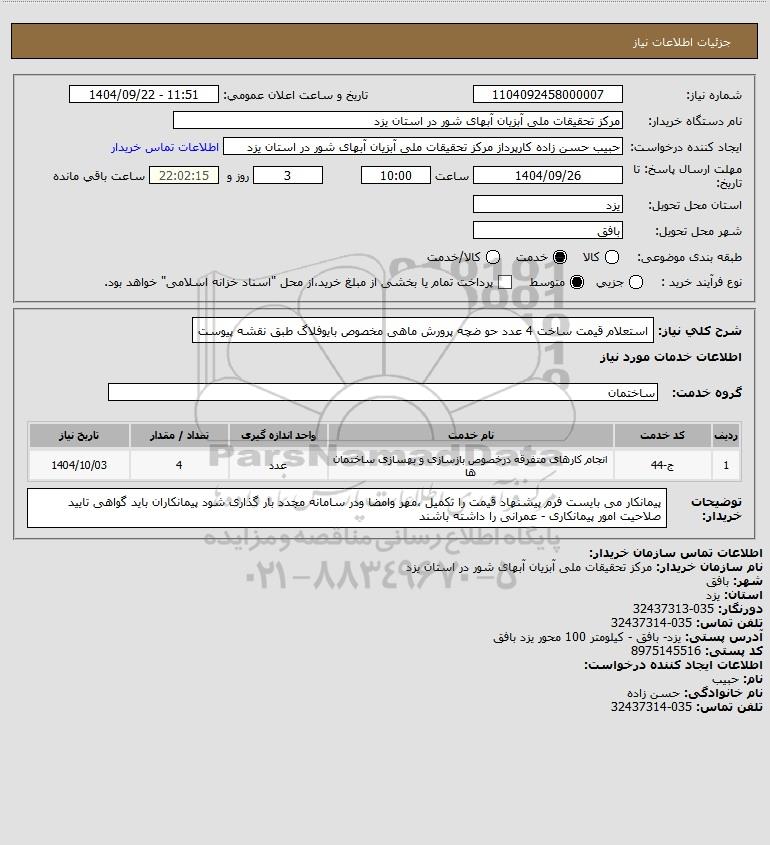 نام دستگاه خریدار:مرکز تحقیقات ملی آبزیان آبهای شور در استان یزد
