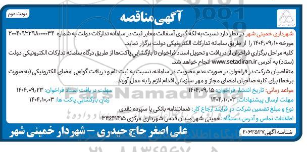 شهرداری خمینی شهر در نظر دارد نسبت به لکه گیری آسفالت معابر ثبت در سامانه تدارکات دولت به شماره 2004093298000034 مورخه 1404.09.10 را از طریق سامانه تداركات الكترونیكی دولت برگزار نماید.