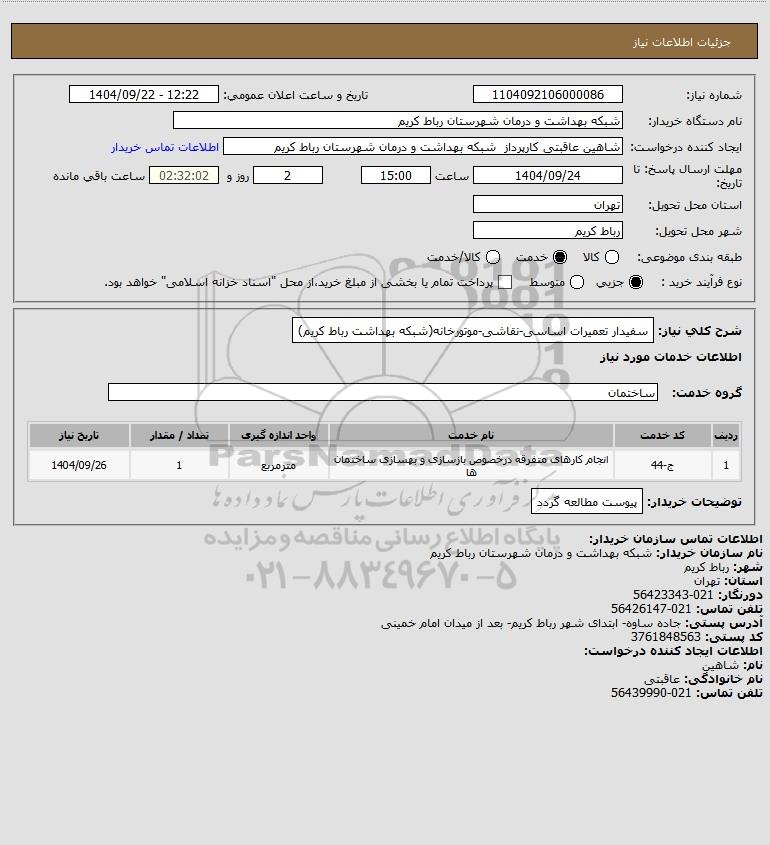 شرح کلی نیاز: سفیدار تعمیرات اساسی-نقاشی-موتورخانه(شبکه بهداشت رباط کریم)