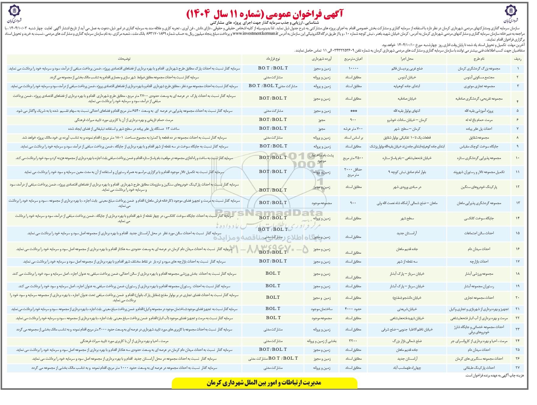 سازمان سرمایه گذاری و مشارکتهای مردمی شهرداری کرمان در نظر دارد با استفاده از سرمایه گذاری و مشارکت بخش خصوصی اقدام به اجرای پروژه های مشارکتی به شرح جدول ذیل نماید. لذا بدینوسیله از کلیه اشخاص حقیقی و حقوقی، دارای دانش، فن آوری، تجربه کاری و علاقه مند به سرمایه گذاری در امور ذیل دعوت به عمل می آید از تاریخ انتشار اگهی لغایت چهارشنبه 1404.10.3 با مراجعه به دبیرخانه سازمان سرمایه گذاری و مشارکت های مردمی شهرداری کرمان به آدرس: کرمان - خیابان شهید باهنر - نبش کوچه شماره 10 و یا از طریق درگاه الکترونیکی این سازمان به آدرس https://investment.kerman.ir و با پرداخت مبلغ پنجاه میلیون ریال به حساب شماره 8631701869 بانک ملت شعبه مرکزی به نام سازمان سرمایه گذاری و مشارکتهای مردمی نسبت به خرید اسناد برگزاری فراخوان اقدام نمایند.