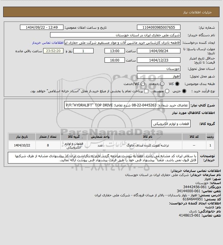 شرح کلی نیاز: تقاضای خرید شماره: 0445263-22-08 شرح تقاضا: P/F:"HYDRALIFT" TOP DRIVE