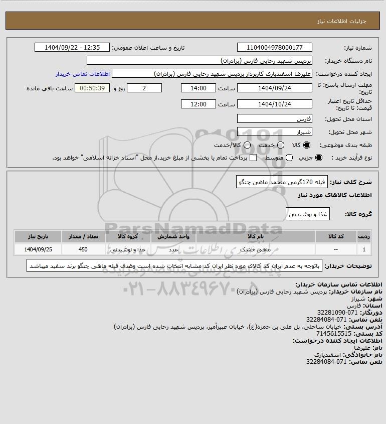 استعلام بها و موضوع استعلام استعلام فیله 170گرمی منجمد ماهی چنگو به اطلاع کلیه شرکتها و افراد متخصص واجد شرایط میرساند، آگهی گذار در نظر دارد از طریق استعلام بها، نسبت به انتخاب و دریافت پیشنهادات اقدام نماید. این استعلام با کد آگهی ثبت شده در سامانه خبرگزاری پارس نماد : 9987708 منتشر شده است. مشخصات استعلام : تاریخ شروع استعلام: 1404/09/22 آخرین مهلت ارسال پیشنهاد قیمت : 1404/09/24 و محل اجرای پروژه : استان فارس میباشد. استعلام قیمت مورد درخواست : استعلام فیله 170گرمی منجمد ماهی چنگو با دستهبندیهای تخصصی و گروه های مرتبط : مواد غذایی, مواد پروتئینی, استعلام اطلاع رسانی میگردد.