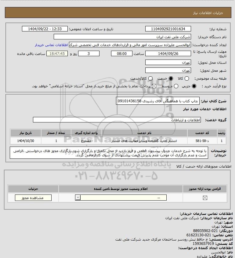 شرح کلی نیاز: چاپ کتاب با هماهنگی آقای رشیدی 09101436158