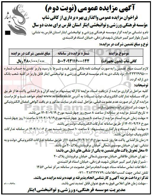 فراخوان مزایده عمومی واگذاری بهره برداری از کافی شاپ موسسه فرهنگی ورزشی و توانبخشی ایثار استان فارس برای مدت 2 سال
