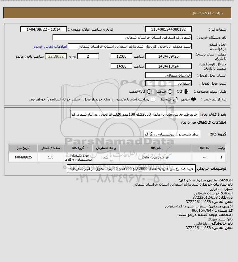 شرح کلی نیاز: خرید ضد یخ بتن مایع به مقدار 2000کیلو 100عدد 20لیتری تحویل در انبار شهرداری
