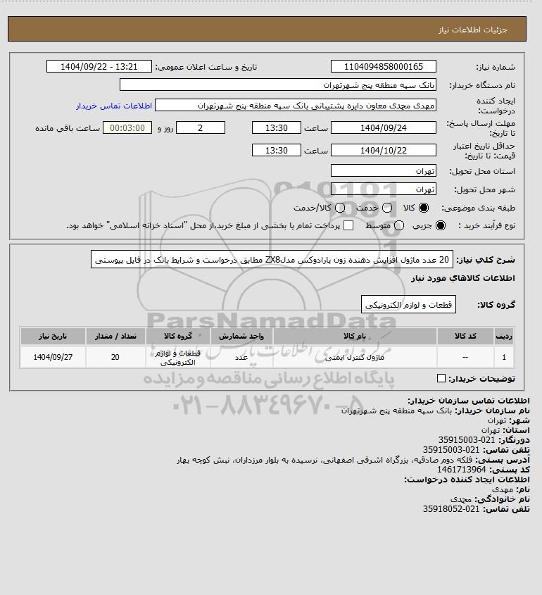شرح کلی نیاز: 20 عدد ماژول افزایش دهنده زون پارادوکس مدلZX8 مطابق درخواست و شرایط بانک در فایل پیوستی