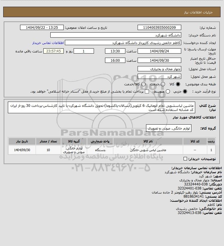 شرح کلی نیاز: ماشین لباسشویی تمام اتوماتیک 6 کیلویی(آبسالان-پاکشوما)-تحویل دانشگاه شهرکرد-با تایید کارشناس-پرداخت 30 روز-از ایران کد مشابه استفاده شده است
