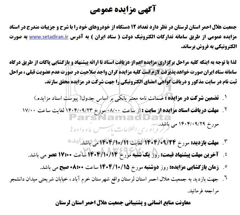 جمعیت هلال احمر استان لرستان در نظر دارد تعداد 12 دستگاه از خودروهای خود را با شرح و جزییات مندرج در اسناد مزایده عمومی از طریق سامانه تدارکات الکترونیک دولت (ستاد ایران ) به آدرس ستاد ایران به صورت الکترونیکی به فروش برساند.