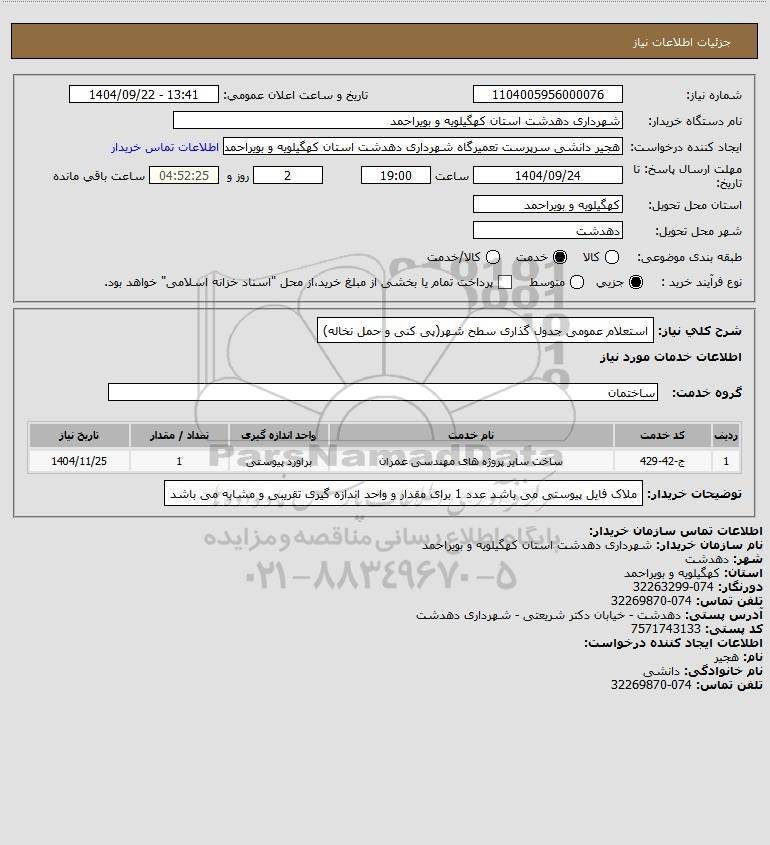 شرح کلی نیاز: استعلام عمومی جدول گذاری سطح شهر(پی کنی و حمل نخاله)
