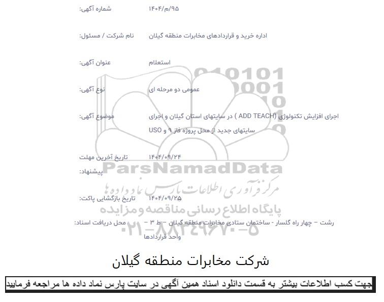 موضوع آگهی: اجرای افزایش تکنولوژی (ADD TEACH )در سایتهای استان گیلان و اجرای سایتهای جدید از محل پروژه فاز 9 و USO