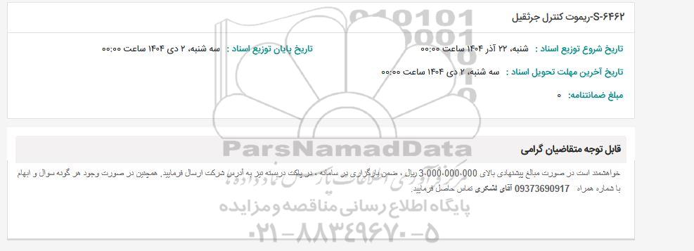 خواهشمند است در صورت مبالغ پیشنهادی بالای 3.000.000.000 ریال، ضمن بارگزاری در سامانه، در پاکت در بسته نیز به آدرس شرکت ارسال فرمایید. همچنین در صورت وجود هرگونه سوال و ابهام با شماره همراه 09373690917 آقای لشکری تماس حاصل فرمایید.