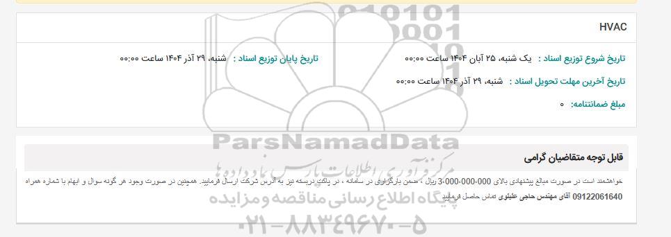 استعلام بها و موضوع استعلام استعلام HVAC به اطلاع کلیه شرکتها و افراد متخصص واجد شرایط میرساند، آگهی گذار در نظر دارد از طریق استعلام بها، نسبت به انتخاب و دریافت پیشنهادات اقدام نماید. این استعلام با کد آگهی ثبت شده در سامانه خبرگزاری پارس نماد : 9988764 منتشر شده است. مشخصات استعلام : تاریخ شروع استعلام: 1404/09/22 آخرین مهلت ارسال پیشنهاد قیمت : 1404/09/29 و محل اجرای پروژه : استان سایر میباشد. استعلام قیمت مورد درخواست : استعلام HVAC با دستهبندیهای تخصصی و گروه های مرتبط : تاسیسات ساختمانی, صنایع حرارتی و برودتی, سیستم تهویه و هواکشی صنعتی, استعلام اطلاع رسانی میگردد.
