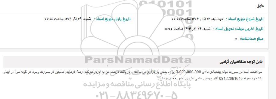 خواهشمند است در صورت مبالغ پیشنهادی بالای 3.000.000.000 ریال، ضمن بارگزاری در سامانه، در پاکت در بسته نیز به آدرس شرکت ارسال فرمایید. همچنین در صورت وجود هرگونه سوال و ابهام با شماره همراه 09122061640 آقای مهندس حاجی علیلوی تماس حاصل فرمایید.