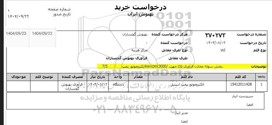 | 1 | 15412011428 | الکتروموتور پمپ استیل | 1 | دستگاه | 1404.08.12 | فرآوری بهنوش گچساران |