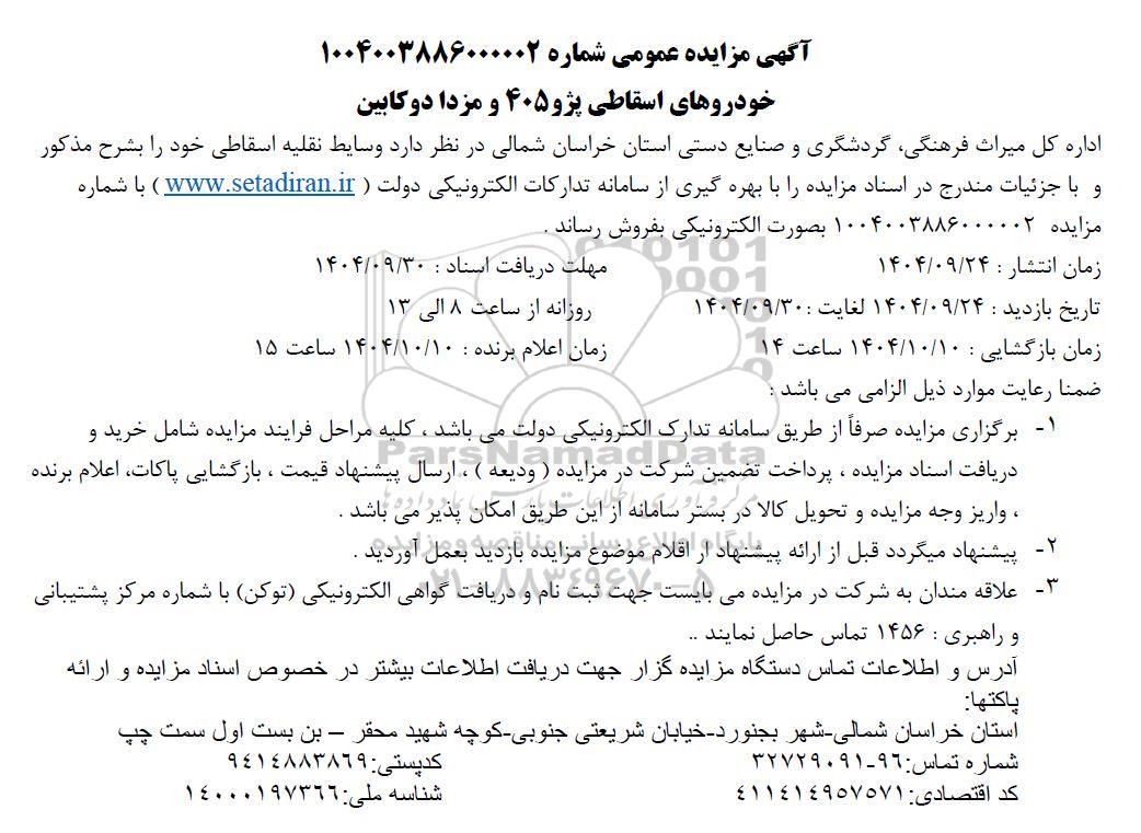 اداره کل میراث فرهنگی گردشگری و صنایع دستی استان خراسان شمالی در نظر دارد وسایط نقلیه اسقاطی خود را بشرح مذکور و با جزئیات مندرج در اسناد مزایده را با بهره گیری از سامانه تدارکات الکترونیکی دولت (ستاد ایران) با شماره مزایده 1004003886000002 بصورت الکترونیکی بفروش رساند.
