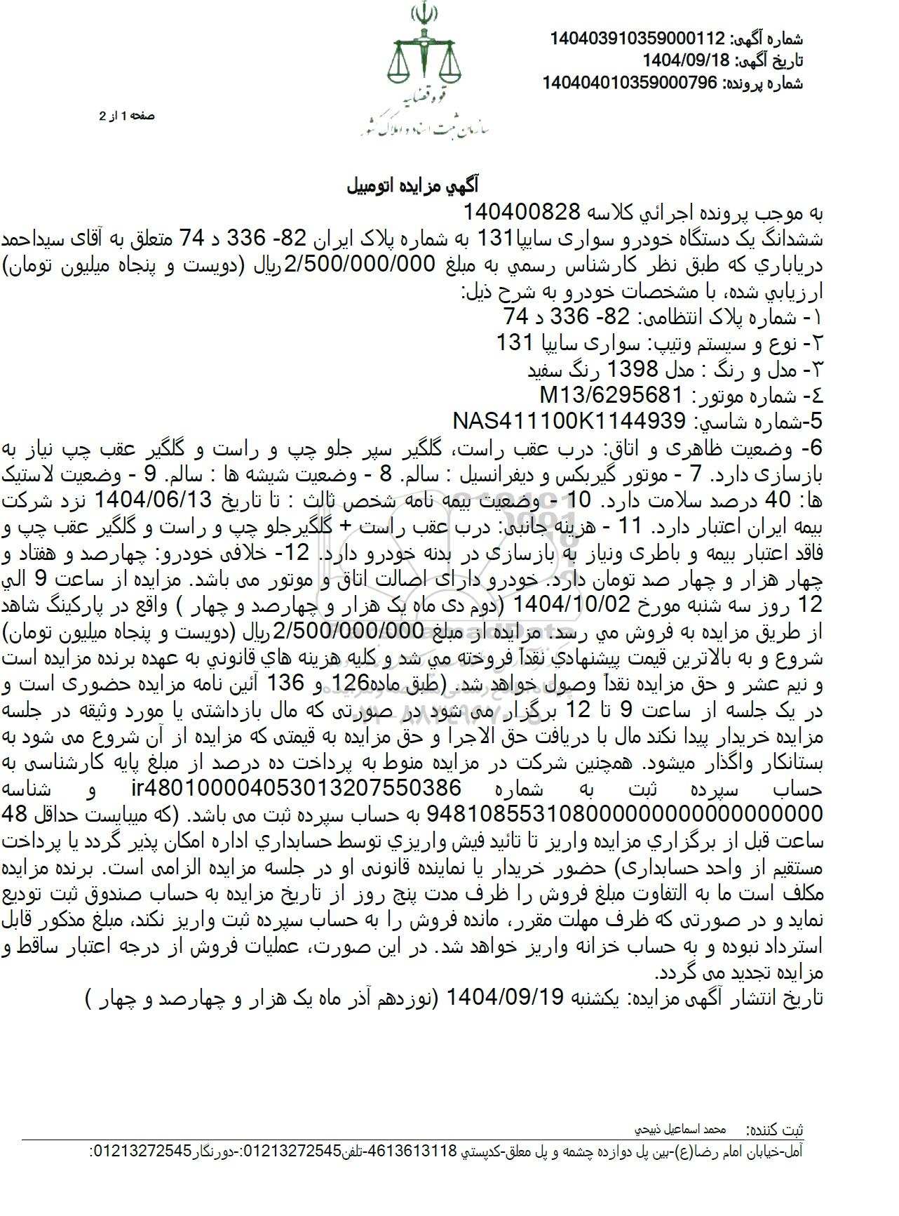 ششدانگ یک دستگاه خودرو سواری سایپا 131 به شماره پلاک ایران 332 د 74 متعلق به آقای سید احمد دریاباری که طبق نظر کارشناس رسمی به مبلغ 2.500.000.000 ریال دویست و پنجاه میلیون تومان ارزیابی شده با مشخصات خودرو به شرح ذیل: