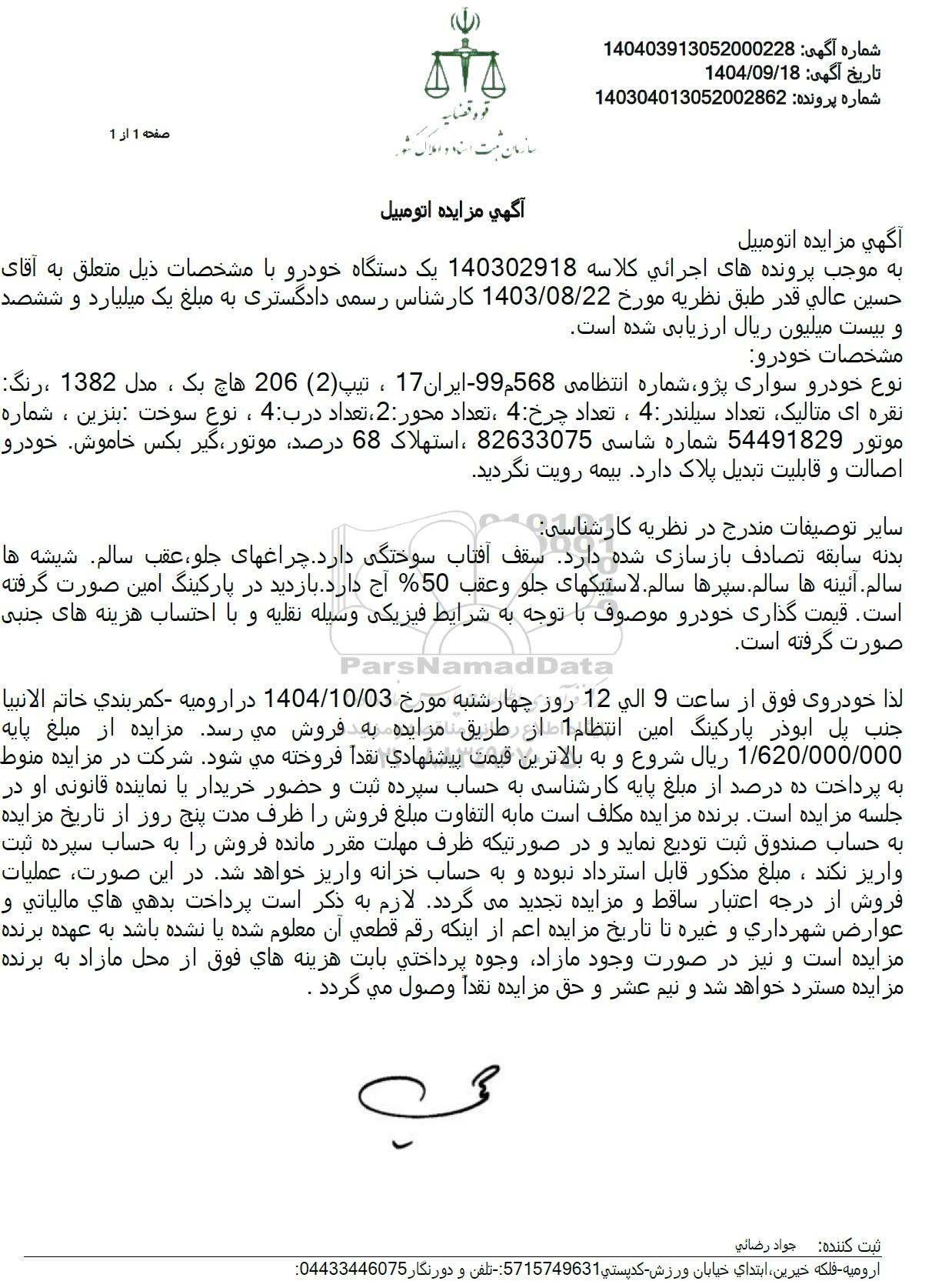 به موجب پرونده های اجرائی کلاسه 140302918 یک دستگاه خودرو با مشخصات ذیل متعلق به آقای حسین عالی قدر طبق نظریه مورخ 1403.08.22 کارشناس رسمی دادگستری به مبلغ یک میلیارد و ششصد و بیست میلیون ریال ارزیابی شده است.