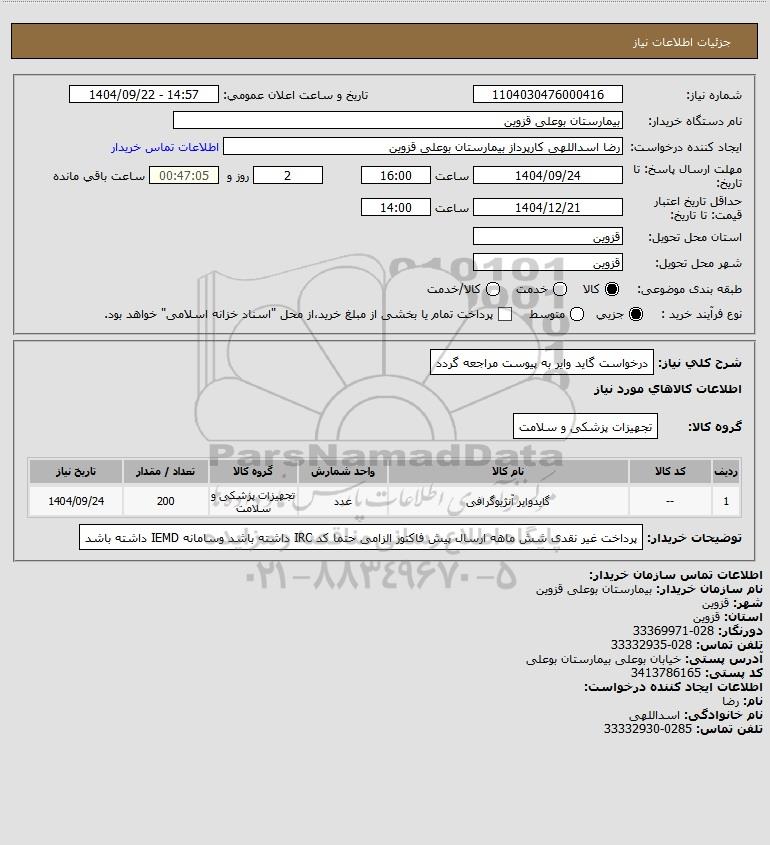 | 1 | -- | گایدوایر آنژیوگرافی | عدد | تجهیزات پزشکی و سلامت | 200 | 1404/09/24 |