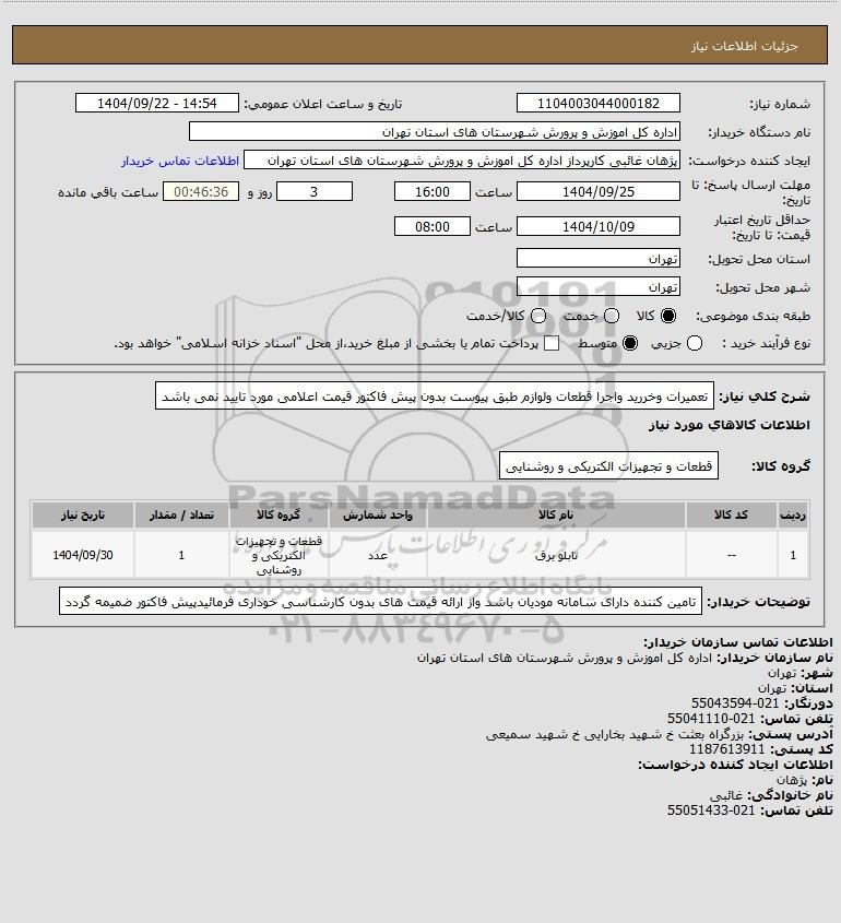 | 1 | -- | تابلو برق | عدد | قطعات و تجهیزات الکتریکی و روشنایی | 1 | 1404/09/30 |