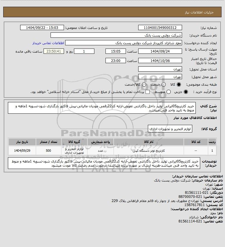 شرح کلی نیاز: خرید کارتریج05ایرانی تولید داخل باگارانتی تعویض-ارایه کد22رقمی مودیان مالیاتی-پیش فاکتور بارگذاری شود-تسویه 1ماهه و منوط به تایید واحد فنی میباشد