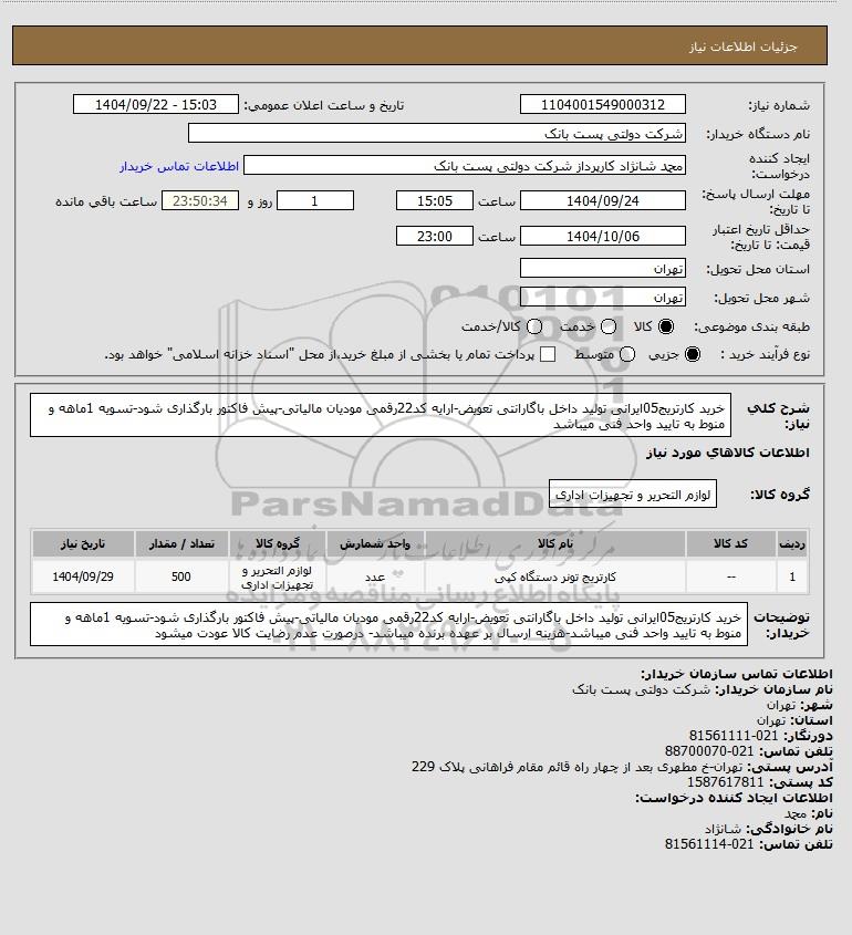 شرح کلی نیاز: خرید کارتریج05ایرانی تولید داخل باگارانتی تعویض-ارایه کد22رقمی مودیان مالیاتی-پیش فاکتور بارگذاری شود-تسویه 1ماهه و منوط به تایید واحد فنی میباشد