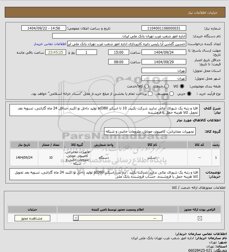 شرح کلی نیاز: افتا و رتبه یک شورای عالی ندارید شرکت نکنید. 10 تا اسکنر ad380 تولید داخل نو اکبند حداقل 24 ماه گارانتی. تسویه بعد تحویل کالا هزینه حمل با فروشنده