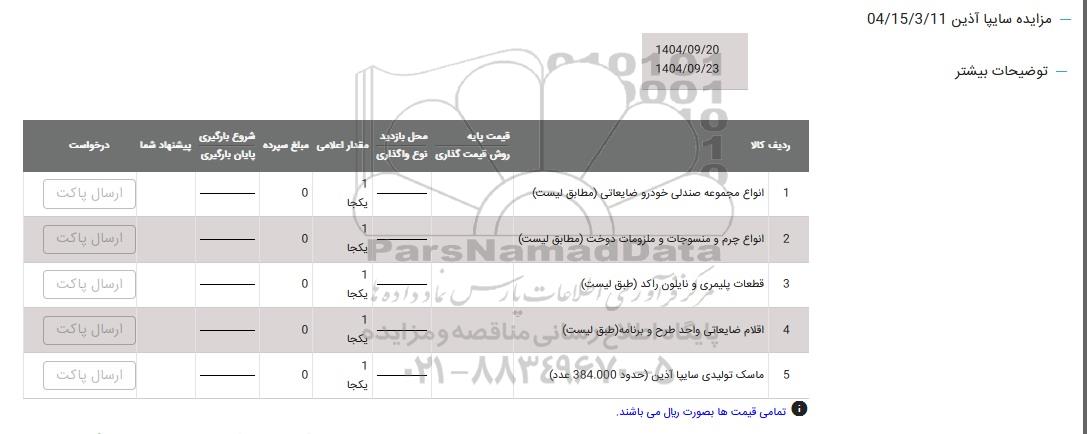 | 5 | ماسک تولیدی سایپا آذین (حدود 384.000 عدد) | 1 یکجا |