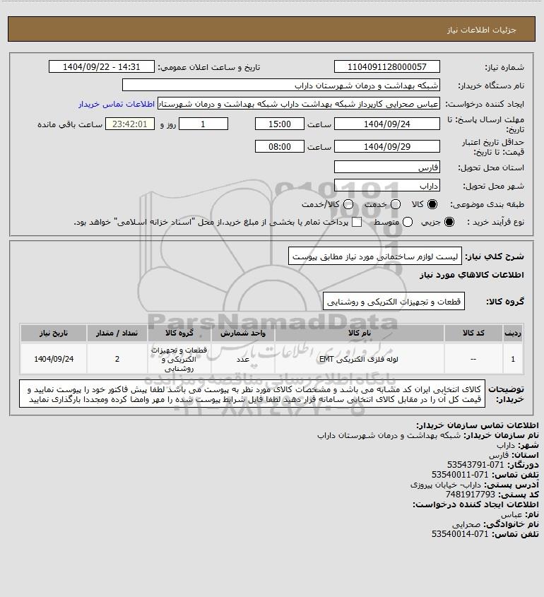 شرح کلی نیاز: لیست لوازم ساختمانی مورد نیاز مطابق پیوست