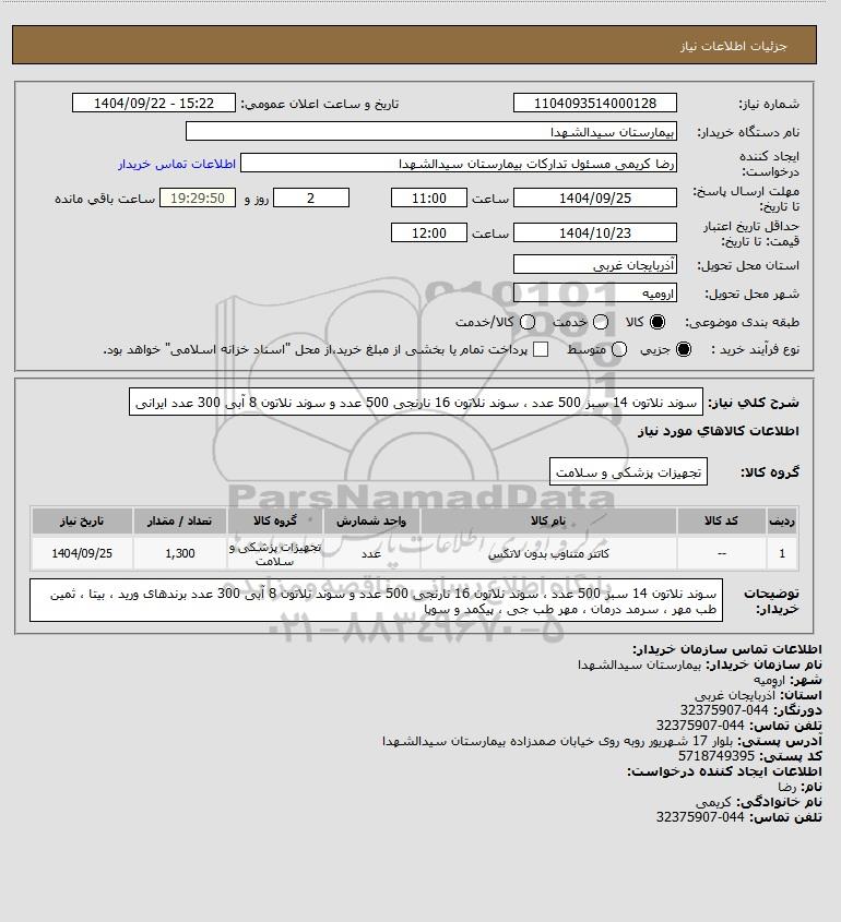 توضیحات خریدار:سوند نلاتون 14 سبز 500 عدد ، سوند نلاتون 16 نارنجی 500 عدد و سوند نلاتون 8 آبی 300 عدد برندهای ورید ، بیتا ، ثمین طب مهر ، سرمد درمان ، مهر طب جی ، پیکمد و سوپا