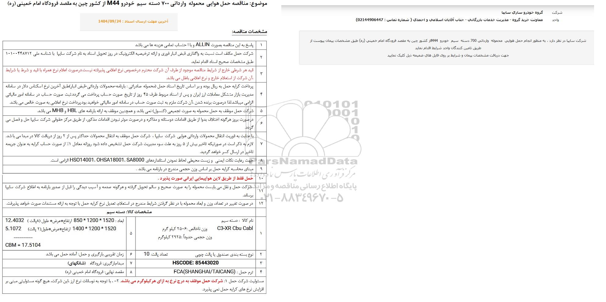 شرکت سایپا در نظر دارد، به منظور انجام حمل هوایی محموله وارداتی 700 دسته سیم خودرو M44 از کشور چین به مقصد فرودگاه امام خمینی (ره) طبق مشخصات پیمان پیوست از