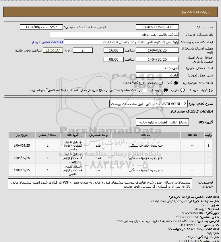شرح کلی نیاز: VOLVO NL 12قطعات یدکی طبق مشخصات پیوست