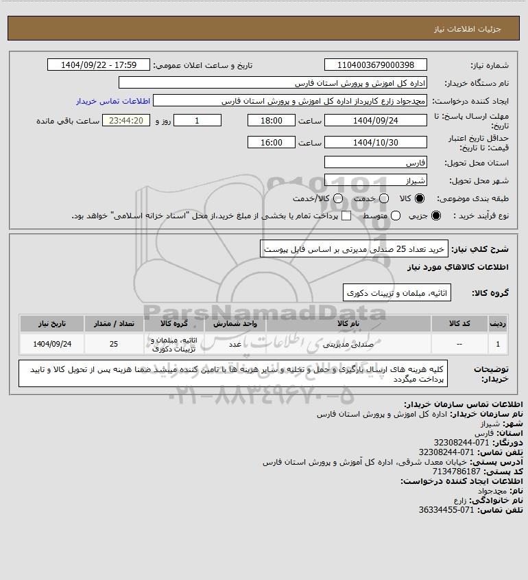 شرح کلی نیاز: خرید تعداد 25 صندلی مدیرتی بر اساس فایل پیوست