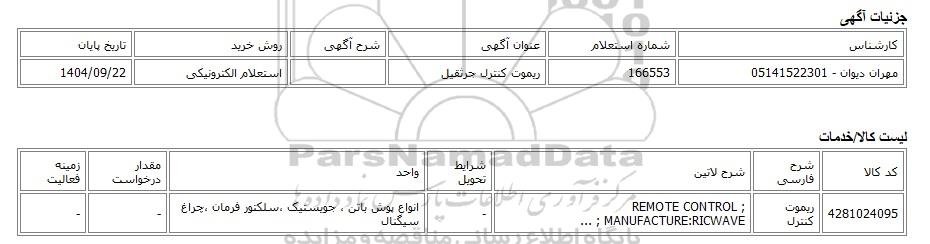 مهران دیوان - 05141522301166553ریموت کنترل جرثقیلاستعلام الکترونیکی1404/09/22