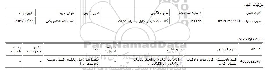 مهران دیوان - 05141522301161156گلند پلاستیکی کابل بهمراه لاکناتاستعلام الکترونیکی1404/09/22