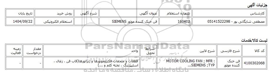| مصطفی شایگانی پور - 05141522298 | 160412 | فن خنک کننده موتور SIEMENS | استعلام الکترونیکی | 1404/09/22 |