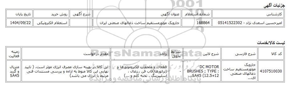 | امیرحسین اسعدی نژاد - 05141522302 | 168864 | جاروبک موتورمستقیم ساخت ذغالهای صنعتی ایران | استعلام الکترونیکی | 1404/09/22 |