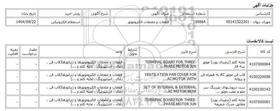 | مهران دیوان - 05141522301 | 159564 | قطعات و ملحقات الکتروموتور | استعلام الکترونیکی | 1404/09/22 |