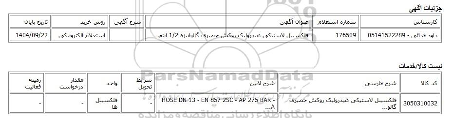 | داود فدائی - 05141522289 | 176509 | فلکسیبل لاستیکی هیدرولیک روکش حصیری گالوانیزه 1/2 اینچ | استعلام الکترونیکی | 1404/09/22 |